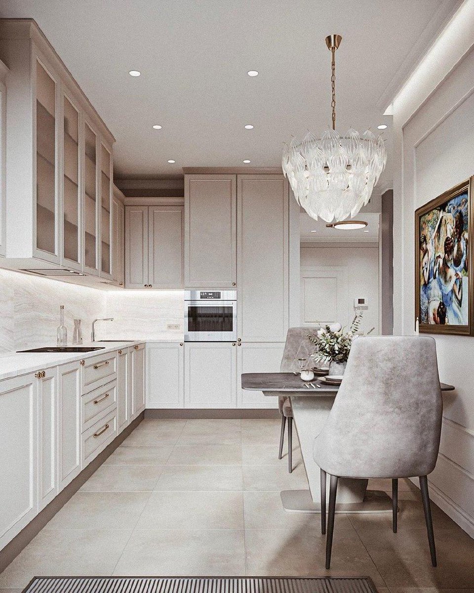 - Size. Large chandeliers attract attention, visually compressing the room, so they are suitable only for spacious kitchens. The lower the ceiling height, the flatter and more compact the chandelier should be. The height from floor to ceiling must be divided by 4 - this will determine the level at which the lighting fixture should be placed. In this case, its lower element must be at least 2 meters from the floor.