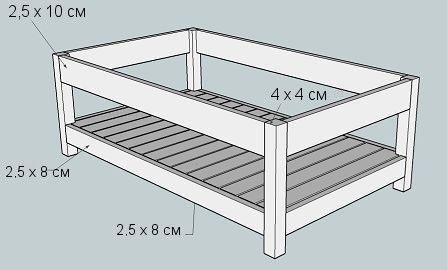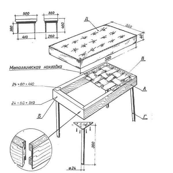 Assembling the frame must begin by assembling a workbench from blanks and connecting them using self-tapping screws. The pre-created bottom is attached to the frame base. Then, using stain, the interior of the structure is painted.