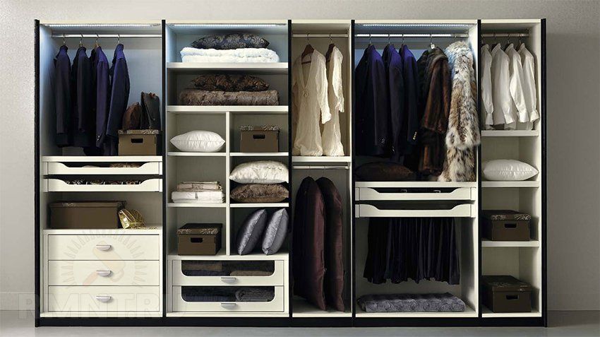 The furniture content of the room consists of the floor, roof and vertical racks, then the necessary modules are added at the request of the customer. Comfortable and compact placement of things depends on filling cabinets or racks with a sufficient number of departments.