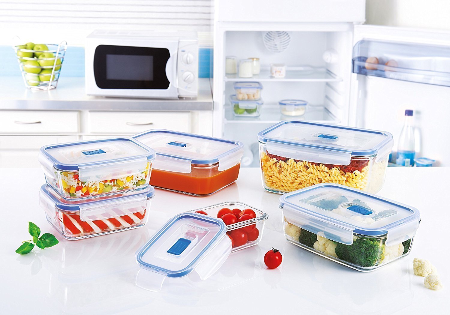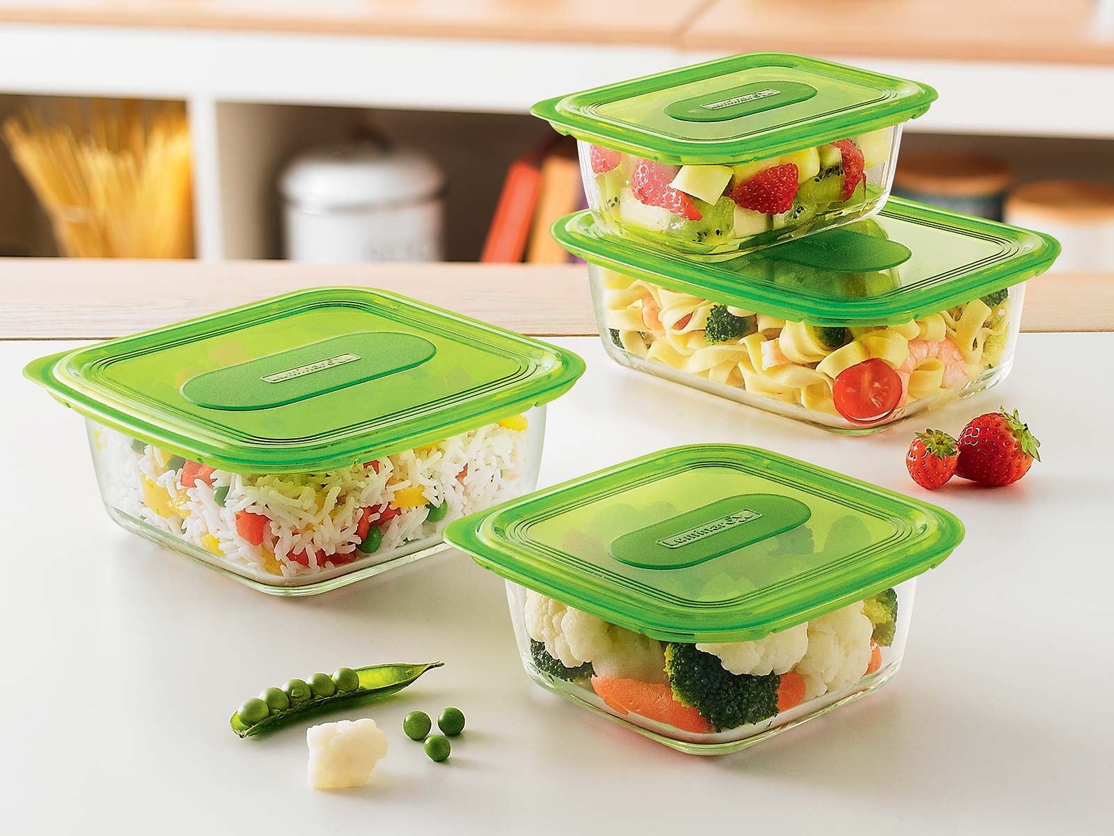 The material of manufacture is borosilicate glass, the lids are plastic. Additionally equipped with a steam release valve. The dishes can withstand heating up to 400 degrees and can be used as a baking dish. It can also be used in the refrigerator/freezer, microwave oven.