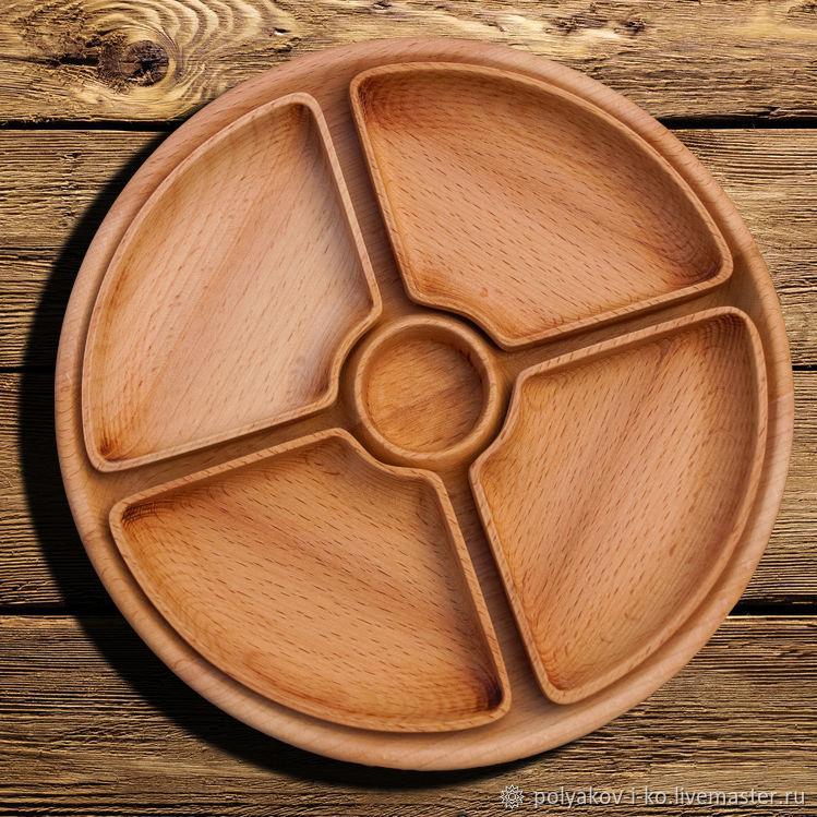 In the center we leave a round hole for a gravy boat or a can of foamy drink. We arrange four recesses around the circumference for different snacks. This is the best option for a plate to make it convenient to use.