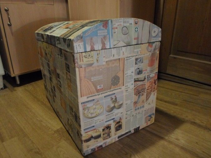 Furniture handle trims can be screwed to the chest if desired, painted brown. You can also staple the straps that will hold the lid, which will make using the item even more comfortable.